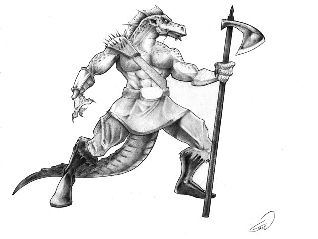 "Só o achamos uma semana depois. Ele estava dormindo em cima de uma árvore. Era um ser estranho, não tão parecido com um homem lagarto. Tinha orelhas de elfo, olhos amarelados e escamas negras. Vestia uma armadura leve, mas não parecia ter arma alguma nas mãos.”.