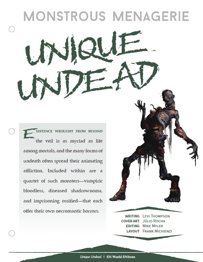 • 501. Monstrous Menagerie: Unique Undead . Todo mundo conhece os mortos-vivos comuns — fantasmas, esqueletos, vampiros, zumbis —, mas há ainda mais desses horrores, alguns com origens pouco ortodoxas e aparências ainda mais estranhas. O que acontece com poderosos necromantes que desenvolvem doenças incuráveis? Ou se um elemental da terra lançar uma maldição que apodrece os ossos? Que tipos de doenças mágicas podem se desenvolver naqueles descendentes de monarquias feiticeiras consanguíneas? O coágulo sem sangue (CR 4), ossificado (CR 2), shadrownoma (CR 1) e shadrownoma (CR 5) mais a doença do shadrownoma! Perigosamente desenhado por Levi Thompson, ilustrado por Júlio Rocha.