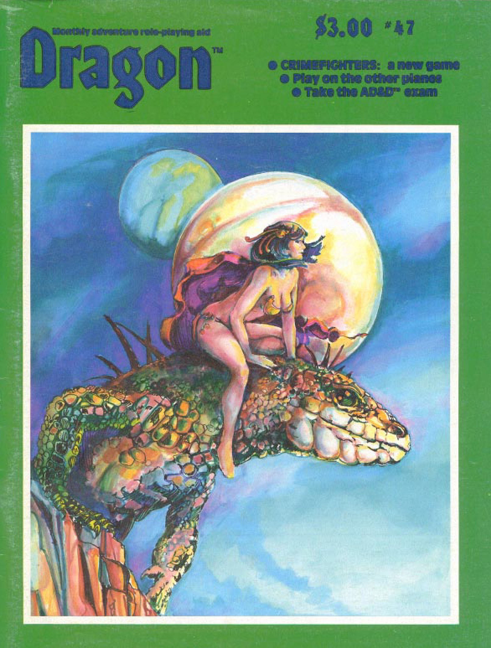 Dragon Publishing lançou a edição 47 da Dragon em março de 1981. Ela tem 80 páginas e um preço de capa de $ 3,00. Nesta edição, temos um novo RPG chamado Crimefighters , aventuras planares e o Exame AD&D !