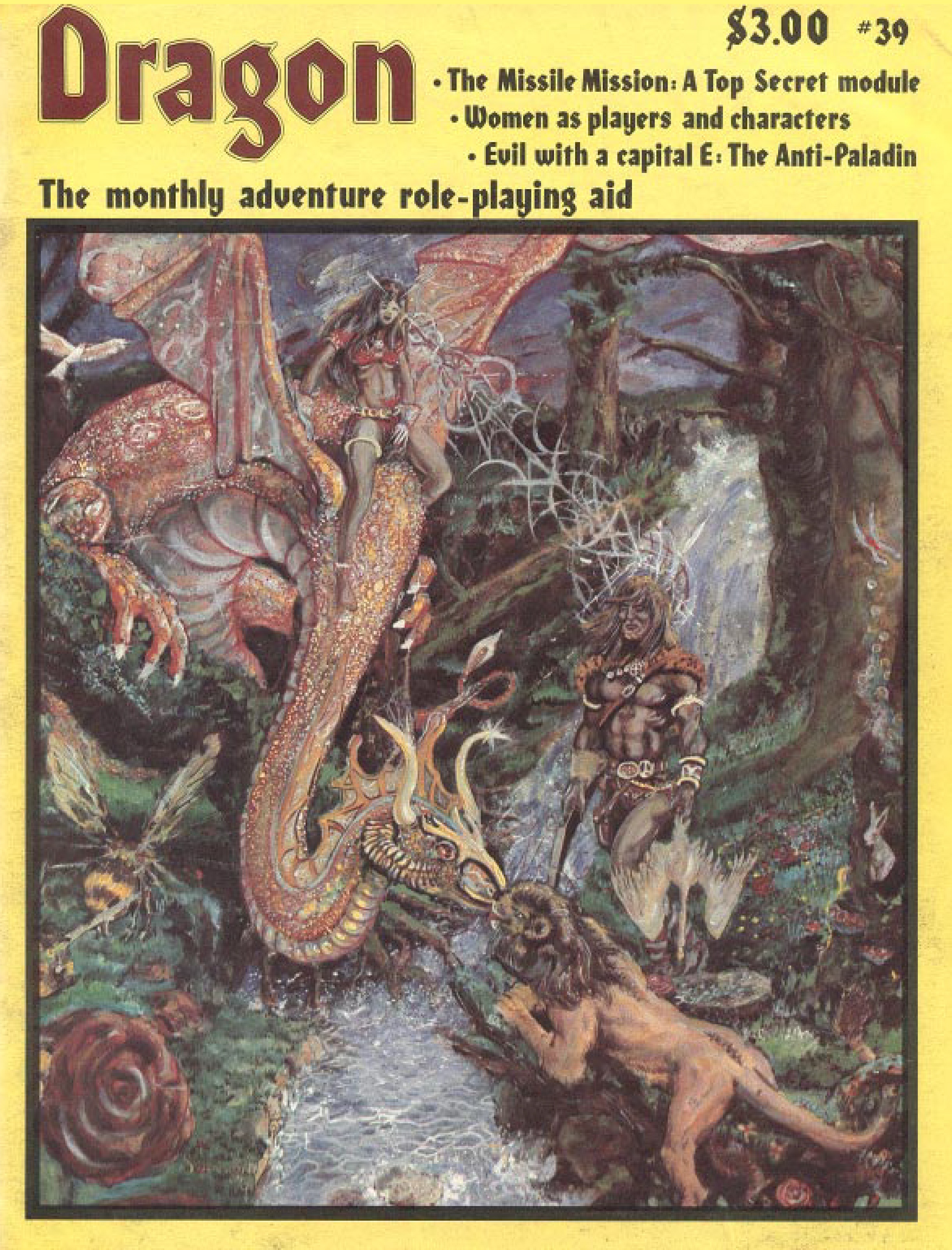 Dragon Publishing lançou a edição 39 de The Dragon em julho de 1980. Ela tem 78 páginas e um preço de capa de US$ 3,00. Nesta edição, temos uma aventura Top Secret , muitos itens mágicos novos e um artigo sobre mulheres nos jogos!