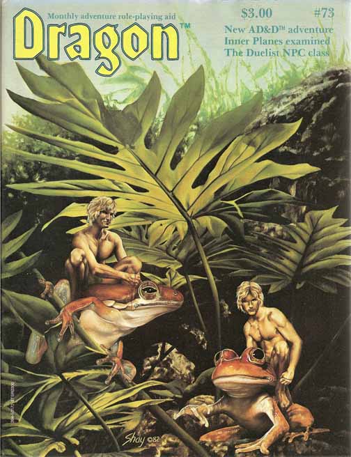 A Dragon Publishing lançou Dragon #73 em maio de 1983. Tem 100 páginas e tem um preço de capa de $3,00. Nesta edição, temos meio-ogros, itens mágicos não violentos e os planos internos!