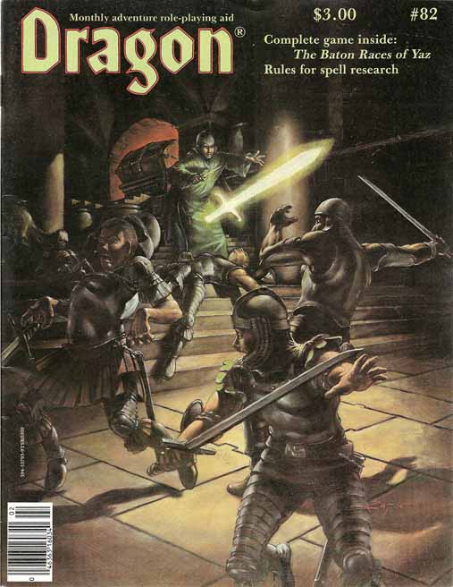 Dragon Publishing lançou Dragon #82 em fevereiro de 1984. Tem 84 páginas e um preço de capa de $3,00. Esta edição traz um novo jogo de tabuleiro, o infame Monty Haul, e anéis mágicos!