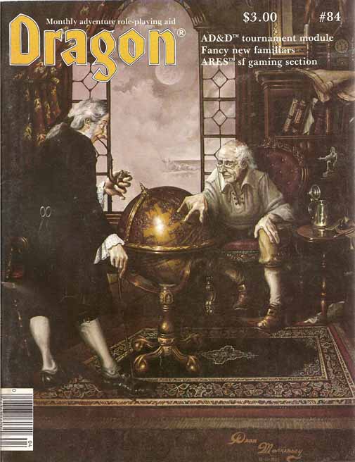 Dragon Publishing lançou Dragon #84 em abril de 1984. Tem 100 páginas e tem um preço de capa de $3,00. Esta edição apresenta um módulo de torneio, uma prévia do D&D Companion Set e a estreia da seção de jogos de ficção científica ARES!